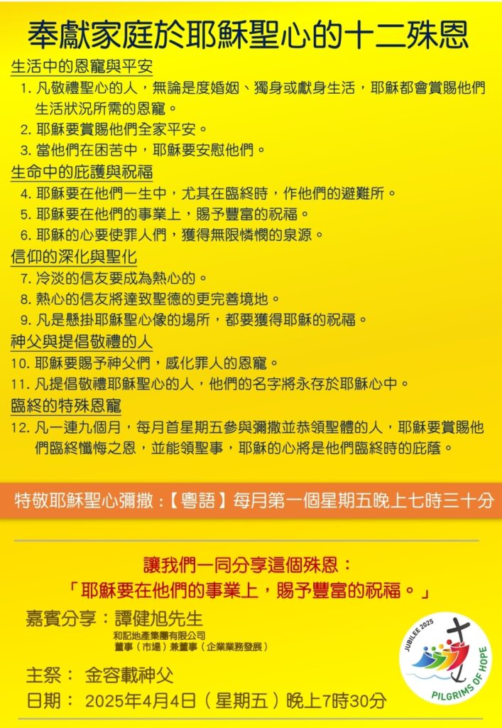 在2025年,我們慶祝建堂的百周年紀念,這是一個推廣耶穌聖心敬禮的良機。在這一年中,我們將舉辦多種靈修活動,包括特別的耶穌聖心彌撒,每個月都將圍繞耶穌聖心的12殊恩設立主題。我們從1月開始,邀請不同的神父主持這些彌撒,並邀請相關人士分享與耶穌聖心及其12殊恩主題相關的信仰經驗。這些分享將使彌撒更加豐富,幫助更多的教友認識並接近耶穌,與祂結合,從而獲得更多的恩寵。