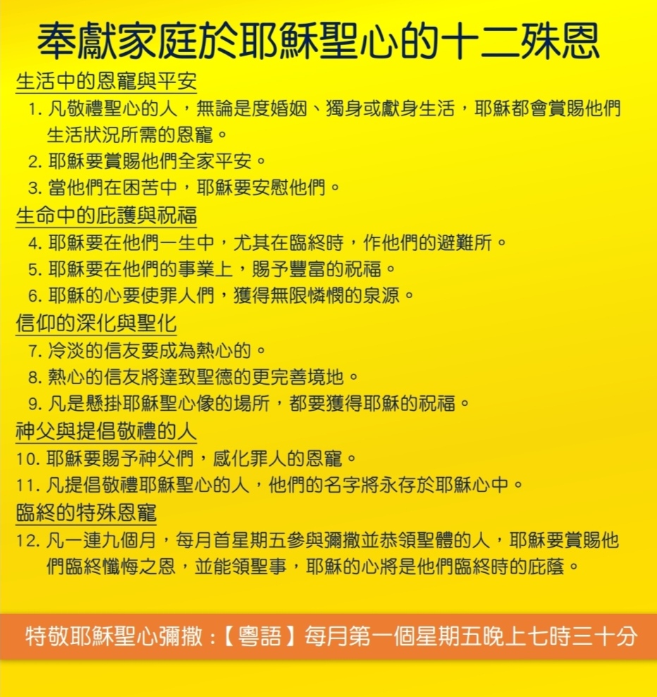 凡連續九個月,每月首星期五參與耶穌聖心彌撒並恭敬領聖體者,將獲得耶穌聖心的12殊恩。