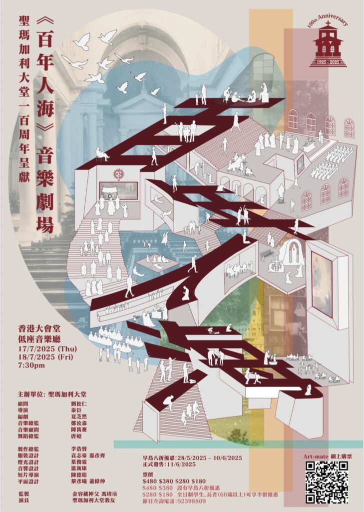 一段跨越百年的信仰傳承,一個家族三代的真摯情誼,透過音樂劇感受到天主的愛,跨越百年的愛情,常與我們同在。任何受造之物,都不能使我們跟天主的愛相隔絕。《百年人海》以音樂、戲劇與舞蹈,穿梭時空,述說聖瑪加利大堂與香港人同行的百年故事。