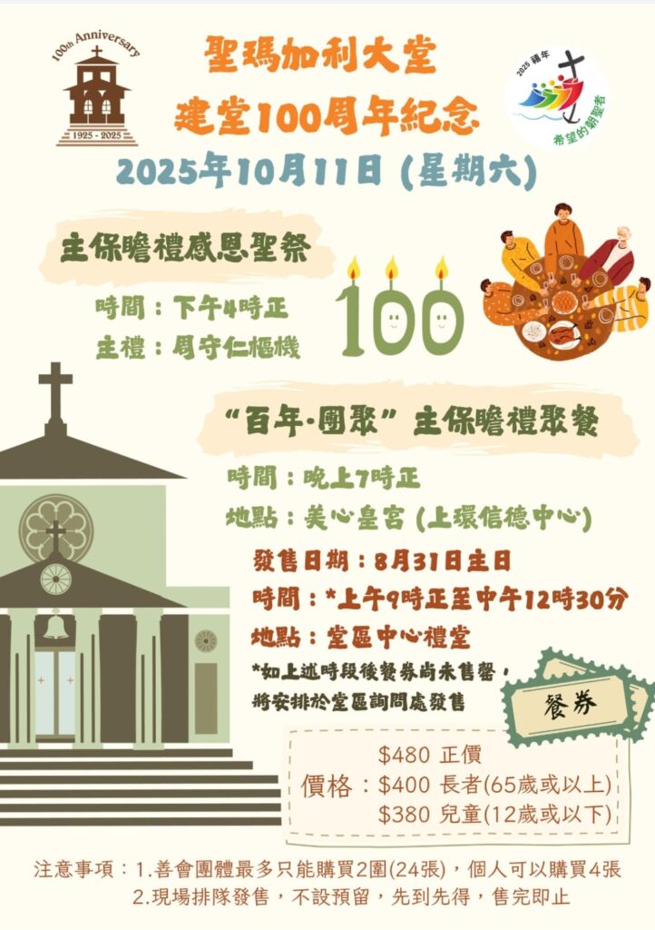 週六1110月全天百周年活動主保瞻禮彌撒及聚餐主保瞻禮彌撒及聚餐(全天: 星期六) 聖瑪加利大堂百周年活動:百周年活動 活動標籤主保瞻禮,彌撒,聚餐